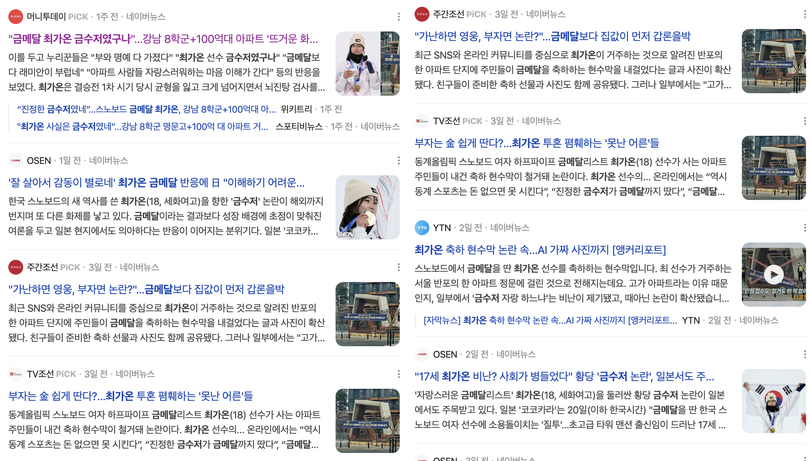 이러한 질투의 화살은 비단 공조직에만 머물지 않고, 순수해야 할 스포츠계마저 관통합니다. 한국 스키 역사상 최초로 금메달을 목에 건 최가온 선수를 향한 대중의 이중적인 잣대는 충격 그 자체였습니다. 1, 2차 시기의 거듭된 실패와 좌절을 딛고 3차 시기에서 극적인 드라마를 써 내려간 10대 소녀의 투혼은 마땅히 기립 박수를 받아야 마땅했습니다. 그러나 그녀가 반포 래미안 원펜타스라는 최고급 신축 아파트에 거주하는 이른바 ‘금수저’라는 사실이 언론을 통해 알려지자, 대중의 환호는 순식간에 차가운 조롱과 비아냥으로 돌변했습니다. "금수저가 딴 금메달은 감동이 덜하다"는 가혹한 평가가 줄을 이었고, 급기야 아파트 단지에 걸린 축하 현수막을 철거하라는 악성 민원까지 빗발쳤습니다. 빙판 위에서 흘린 땀방울과 뼈를 깎는 훈련의 고통은 ‘부유한 배경’이라는 단어 하나에 속절없이 지워졌습니다. 도대체 우리는 왜 성공의 이면에 담긴 개인의 고독한 인내는 철저히 외면한 채, 겉으로 드러난 조건표만 쥐고 타인을 난도질하려 드는 것일까요?